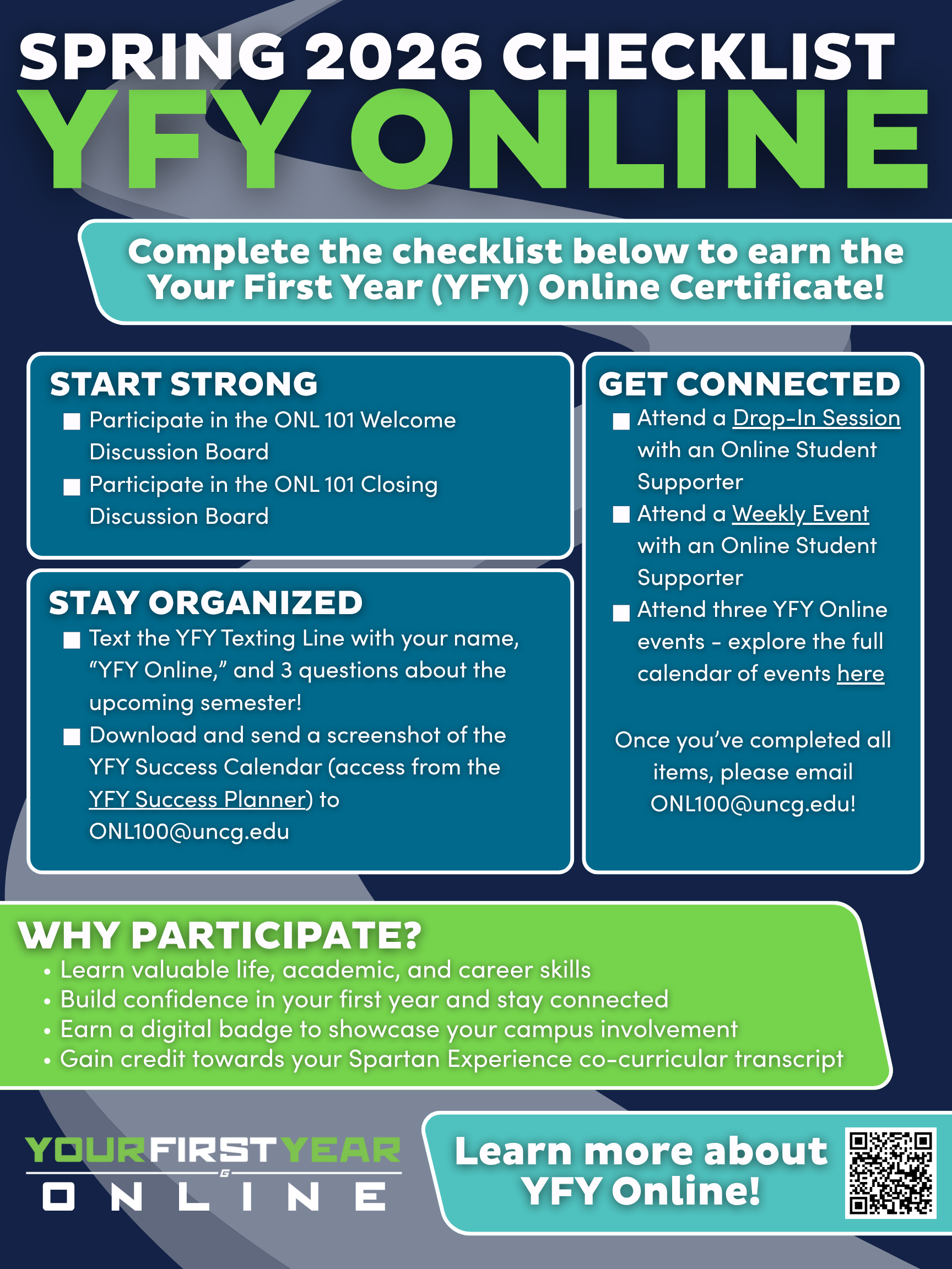 The YFY Online Certificate Program is a recognition and engagement initiative designed specifically for first-year online degree-seeking students at UNCG. It rewards you for actively participating in programs and activities that support your academic success, personal growth, and community connection!